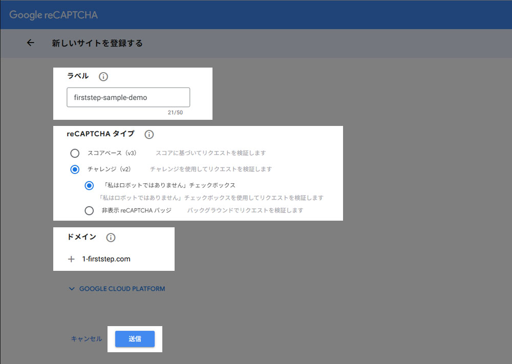 以下のような画面になるので、reCAPTCHAを使用するサイトを登録してください。