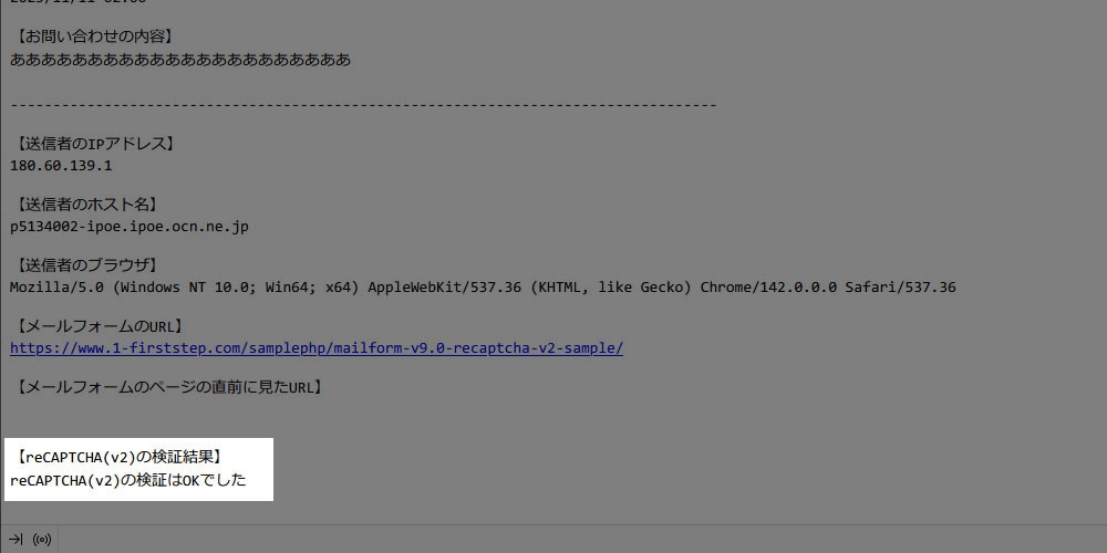 次にフォームを送信し、管理者に届くメールの最下部に【reCAPTCHA(v2)の検証結果】という項目が記載されているかの確認をしてみましょう。(これはrecaptcha-v2-config.phpの設定で非表示にすることもできます)