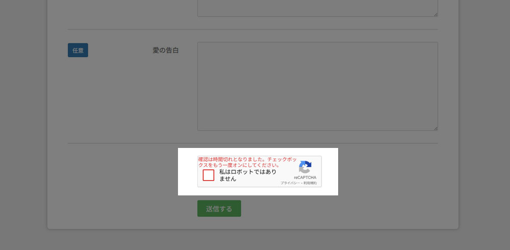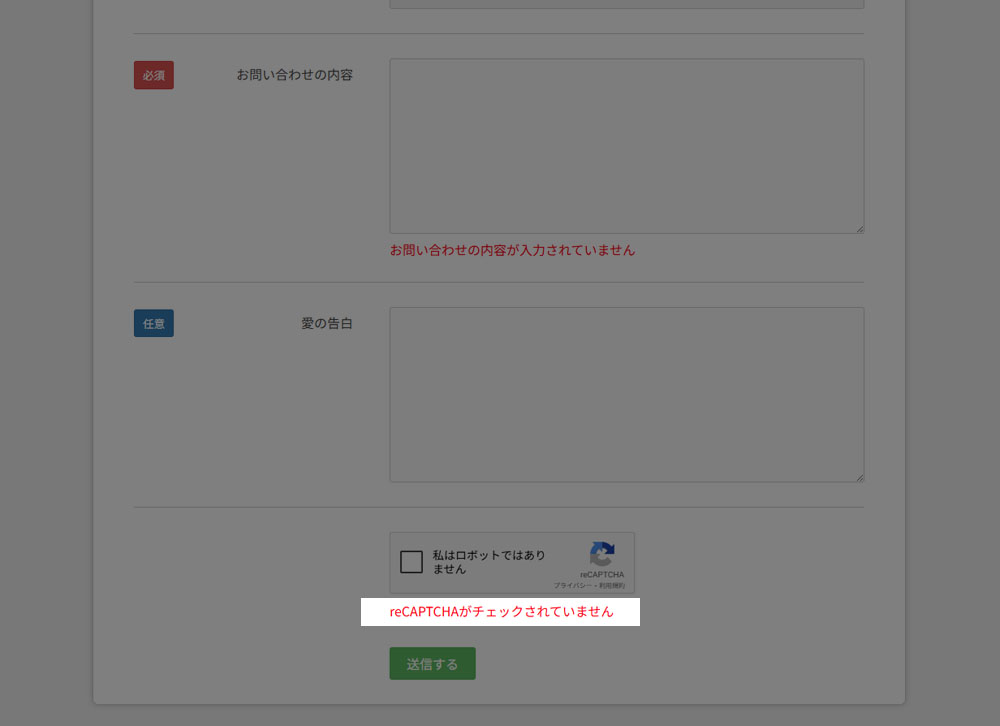 reCAPTCHAのチェックボックスにチェックを入れずに「送信する」のボタンを押すと、「reCAPTCHAがチェックされていません」というエラーメッセージが赤文字で表示されます。