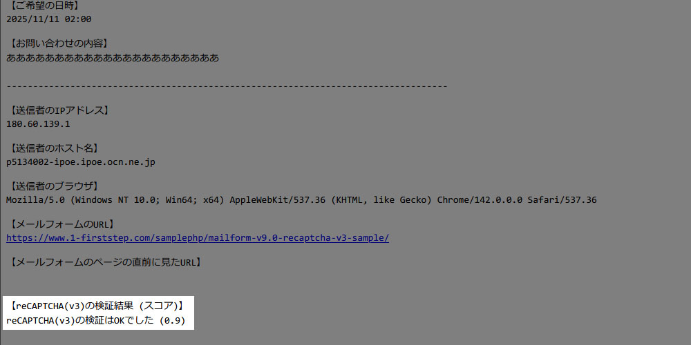 または、最初はあえて0.0にしてbotを含む全てのフォーム送信を許可しておき、サイト管理者に届くメールの最下部に記録されるreCAPTCHA(v3)のスコアを確認し、botからのフォーム送信が減っていくように段階的に数値を上げていくのも良いかもしれません。