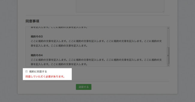 「規約に同意する」のチェックボックスにチェックを入れずに送信ボタンを押してみて、赤文字のエラーメッセージが表示されるかの確認をしてみましょう。